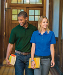 preshrunk 100% combed ring-spun cotton double piqué knit • 6.5 oz. • missy contoured silhouette with side seams and side vents • contoured welt collar and cuffs • rolled-forward topstitched shoulders • 3 matching buttons on a clean-finished reversed placket with reinforced bottom box • double-needle bottom hem • heat transfer label • Sizes: S-3XL